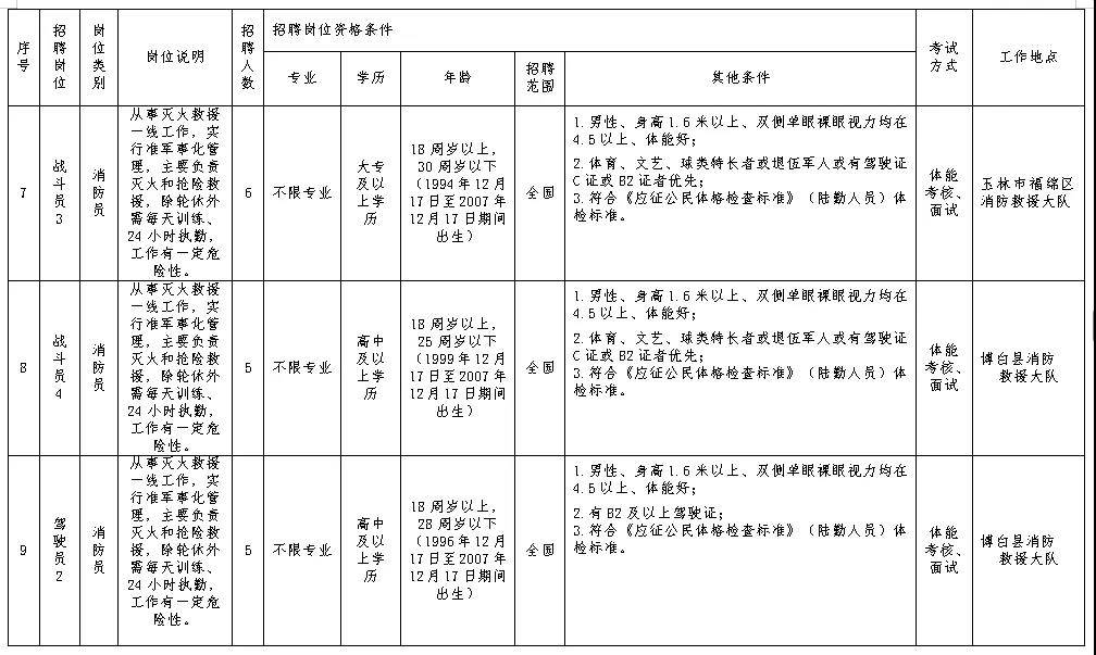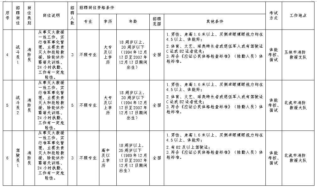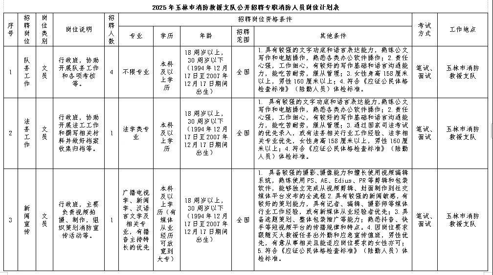 (五)符合招聘岗位所要求的岗位资格条件:具体岗位的相关资格条件详见《2025年玉林市消防救援支队公开招聘专职消防人员岗位计划表》(附件1)。