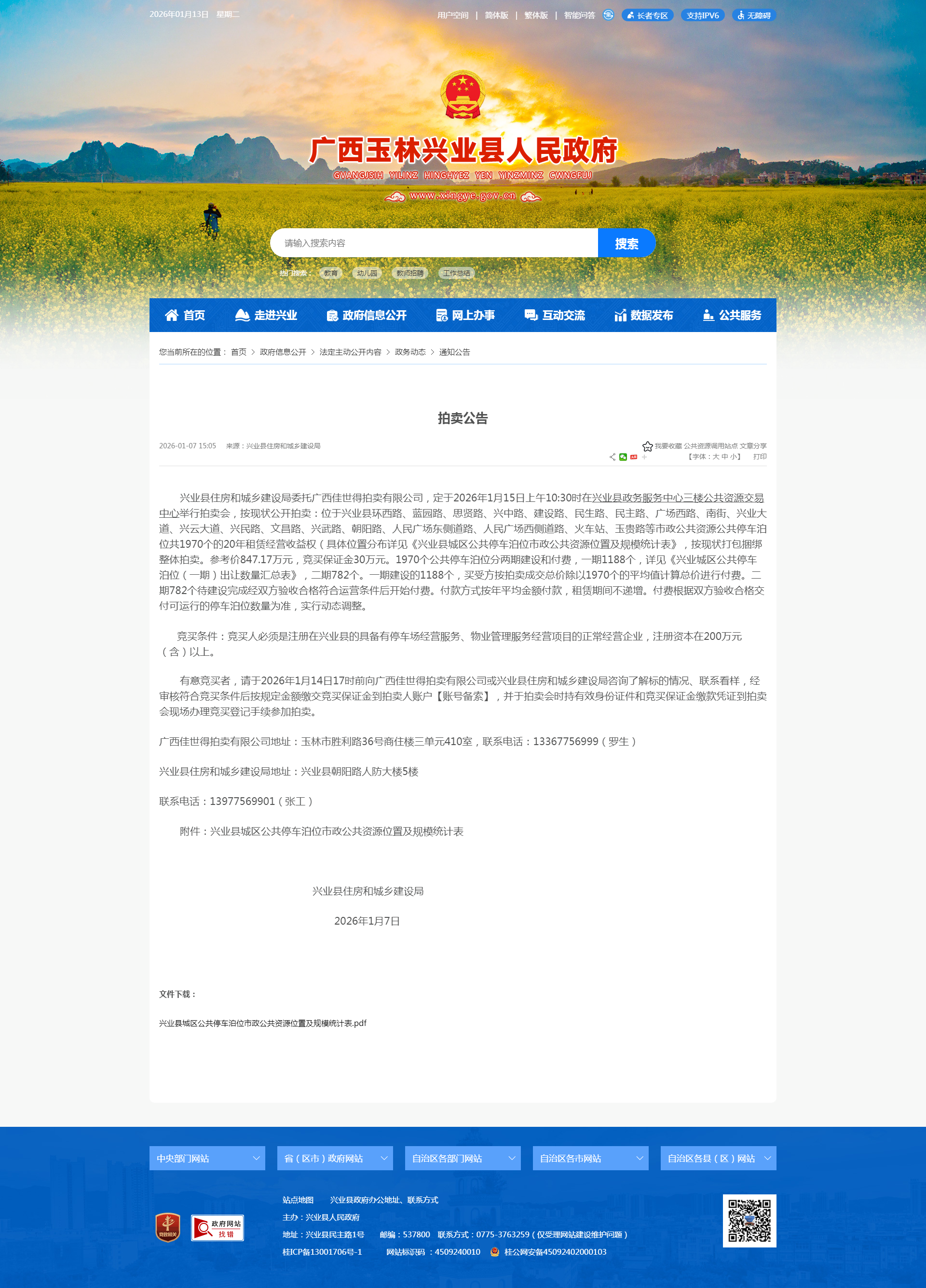 兴业县住房和城乡建设局委托广西佳世得拍卖有限公司,定于2026年1月15日上午10:30时在兴业县政务服务中心三楼公共资源交易中心举行拍卖会,按现状公开拍卖:位于兴业县环西路、蓝园路、思贤路、兴中路、建设路、民生路、民主路、广场西路、南街、兴业大道、兴云大道、兴民路、文昌路、兴武路、朝阳路、人民广场东侧道路、人民广场西侧道路、火车站、玉贵路等市政公共资源公共停车泊位共1970个的20年租赁经营收益权(具体位置分布详见《兴业县城区公共停车泊位市政公共资源位置及规模统计表》,按现状打包捆绑整体拍卖。参考价847.17万元,竞买保证金30万元。1970个公共停车泊位分两期建设和付费,一期1188个,详见《兴业城区公共停车泊位(一期)出让数量汇总表》,二期782个。一期建设的1188个,买受方按拍卖成交总价除以1970个的平均值计算总价进行付费。二期782个待建设完成经双方验收合格符合运营条件后开始付费。付款方式按年平均金额付款,租赁期间不递增。付费根据双方验收合格交付可运行的停车泊位数量为准,实行动态调整。